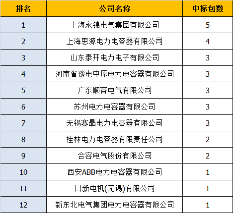 上海思源电力电容器有限公司、桂林电力电容器有限责任公司2家企业各中8包紧随其后,并列第二。西安西电电力电容器有限责任公司中7包位列标榜第三。