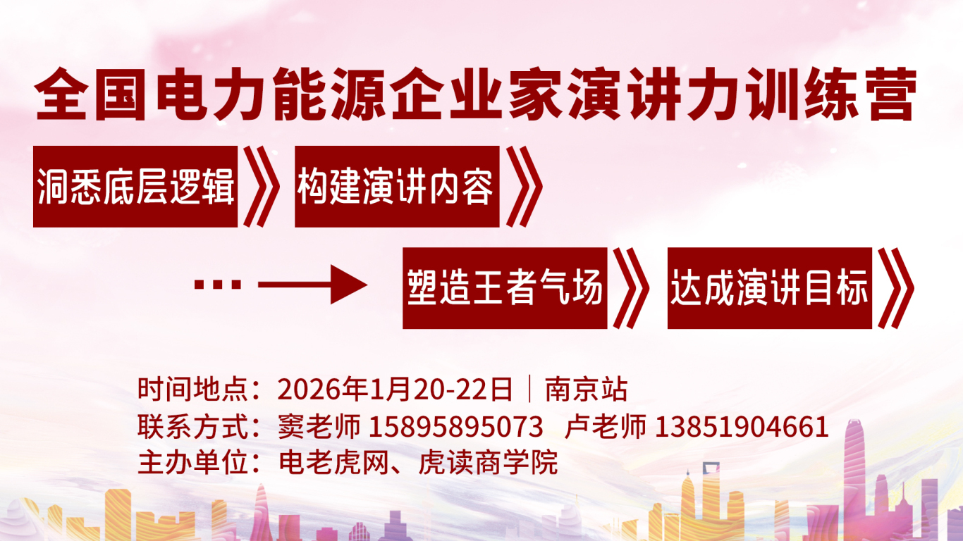 在企业前行的道路上,许多领导者能攻克技术的堡垒,能捕捉市场的风向,却往往在一方讲台前陷入沉默——心里有万千韬略,站上台却讲不透、说不响、传不远。 “手握好牌,却打不出气势”、“团队带不齐,战略推不动”、“关键时刻掉链子,眼看着机会溜走”……这些说不出的焦虑,并非少数人的困境,而是众多企业领导者共同面对的“表达之痛”。在这个需要持续建立信任、影响他人的时代,演讲力,早已不是锦上添花,而是企业总裁必须握于手中的“软实力枪杆”。 为此,电老虎网联合国内演讲力训练权威专家、北京大学公众演讲与管理沟通课题组原组长——文若河老师,精心打造了——《电力能源企业家演讲力训练营》。 ✔ 掌握一套可复制的演讲系统,任何场合都能轻松精彩演讲; ✔ 通过演讲收服人心,打造具有超强凝聚力和执行力的团队; ✔ 借助演讲推介产品,吸引投资,提升品牌,变现商业价值。 最终实现:有人认、有人跟、有人挺。 ✔ 企业创始人、董事长、企业家、总经理等决策层领导者; ✔ 集团公司事业部负责人、分公司一把手、核心高管等; ✔ 即将接班或正在推动企业变革的二代企业家、新高管; ✔ 一切渴望突破表达瓶颈,实现事业大飞跃的精英人士。 ▶理论奠基:构建了中国本土式演讲训练体系——口才树理论。 ▶专业资历:20年专注企业总裁演讲力理论研究、教学与咨询。 ▶教学实践:北大、浙大等10余所高校EMBA班演讲课程导师。 ▶高端服务:长年担任众多企业家与高管的“私人演讲顾问”。 ▶出版书籍: ▶授课风采: 虎读商学院,是老虎工业云/虎翅云工厂旗下,专业于工业领域的高端圈层学习培训平台。 老虎工业云/虎翅云工厂,作为国内领先的“数字新基建/新商业”平台。目前在南京、盐城、青岛、深圳、上海、金华、包头等地设立有数十个地方总部。 虎读商学创立于2018年,一端是平台聚集了全国高校名师、产业大咖、行业新锐组成的导师资源、以及全国超过数百个地区的政府雄厚资源;一端是超过10万家的工业企业家高端圈层。 虎读商学自创立以来,坚持为企业董事长/总经理/高管等提供全方位的管理能力培养、产业优势资源对接、商业资源合作等。其中《中国电力能源企业家研修班》、《中国工程总包企业家研修班》、《中国新能源产业企业家研修班》、《电网投标总经理特训营》等高端圈层培训学习已经举办多期,“圈层+学习+合作”新方式,持续助力更多学员从优秀走向卓越! 培训时间:2026年1月20日—22日(共3天) 培训地点:江苏·南京 培训对象:企业家、董事长、总经理、副总经理、营销总监、投标负责人、技术总工等核心决策与管理人员。 班级规模:严格限制人数,为确保教学效果与互动体验。 培训费用: ¥6890元/人 ❗早鸟优惠: 如果您也期待: 在任何场合都能自信表达、收服人心 通过演讲推动战略落地、团队凝聚 在重要客户面前展现专业与格局 那么,这场专为电力能源人打造的演讲力训练营,正是为您而来。 联系方式:13851904661 (微信同号,扫码添加咨询)