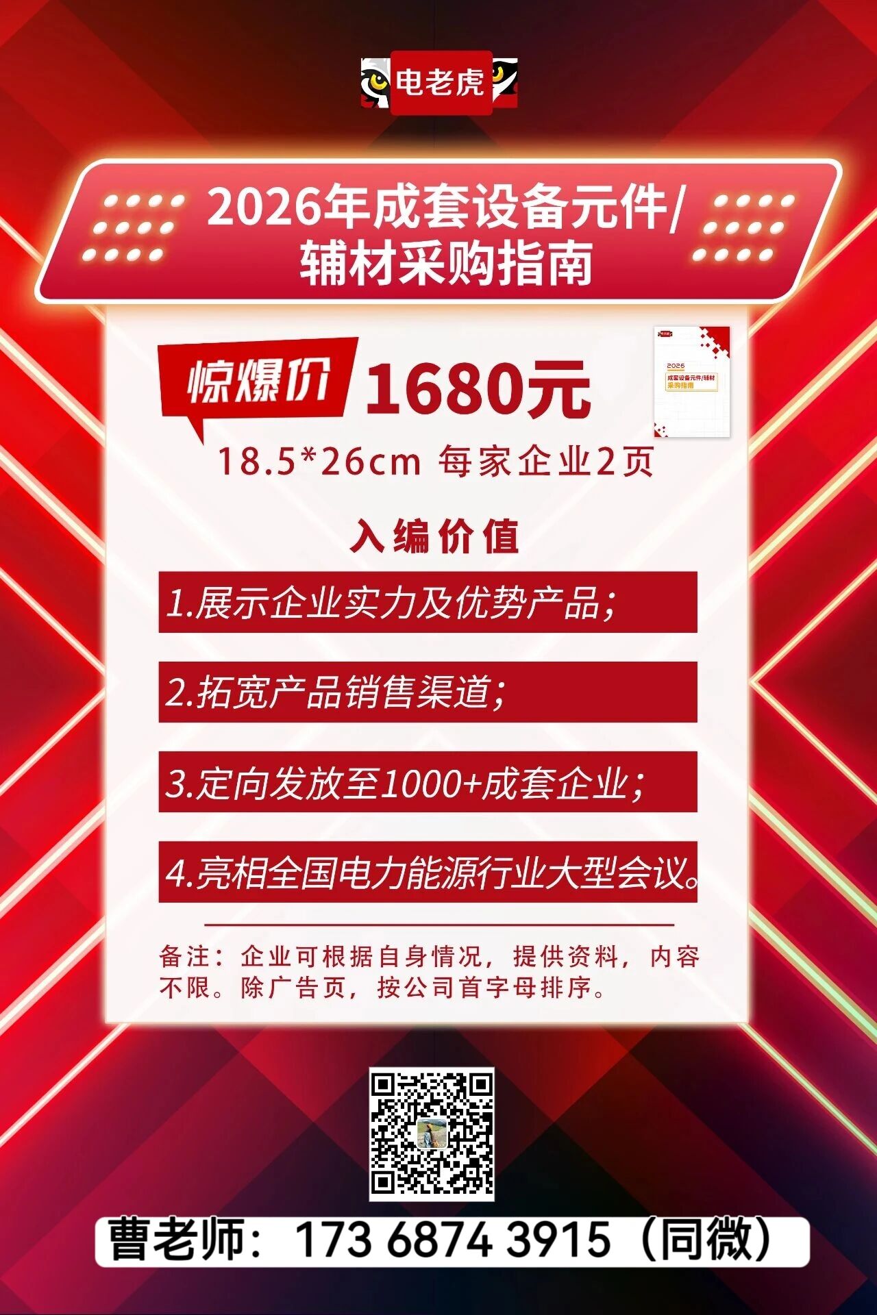 企业入编有哪些价值? 精准直达,覆盖行业核心买家:将精准投放至电老虎网全年电力能源行业大型展会以及线下200+销售资源对接大会、采购大会、创新大会的现场观众,覆盖6万+专业买家,包括电力、工业、能源等领域的决策者、采购负责人与工程师群体! 长效曝光,持续赋能品牌价值:这不仅是一本刊物,更是您全年的“移动名片”。该册将被持续用于行业活动、渠道分发、企业采购部门备案,持续为您带来高质量曝光和合作机会。 低成本高回报,性价比远超传统广告:相比动辄上万的广告投入,入编本指南仅需极低成本,即可获得长期、高效的品牌展示和商机转化,真正实现“小投入,大回报”! 权威背书,提升企业可信度:由电老虎网官方出品,具备极强的行业公信力。