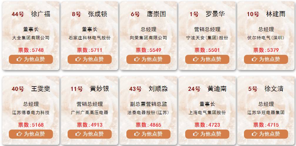 目前排在前十的分别是:大全集团有限公司董事长—徐广福,石家庄科林电气董事长—张成锁, 向荣集团董事长—唐崇国,宁波天安(集团)营销总经理—罗景华,伏尔特电气(深圳)总经理—林建雨;江苏德春电力科技总经理—王雯斐;广州广高高压电器营销总经理—黄妙银;法泰电器股份(江苏)营销总监——刘顺淼;上海电气集团董事长——黄迪南;江苏华冠电器集团总经理—徐文清。