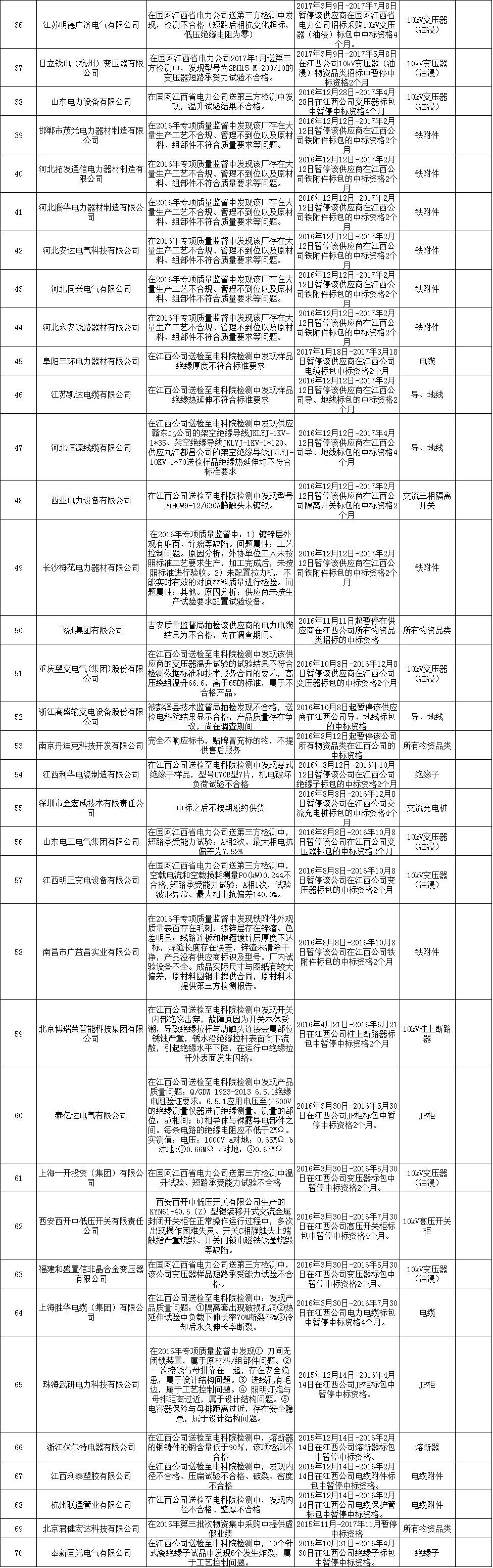 通报48家企业,其中3家企业被取消中标资格。其余均为暂停中标处理,处理范围为10kV柱上断路器、10kV变压器、绝缘子等物资。
