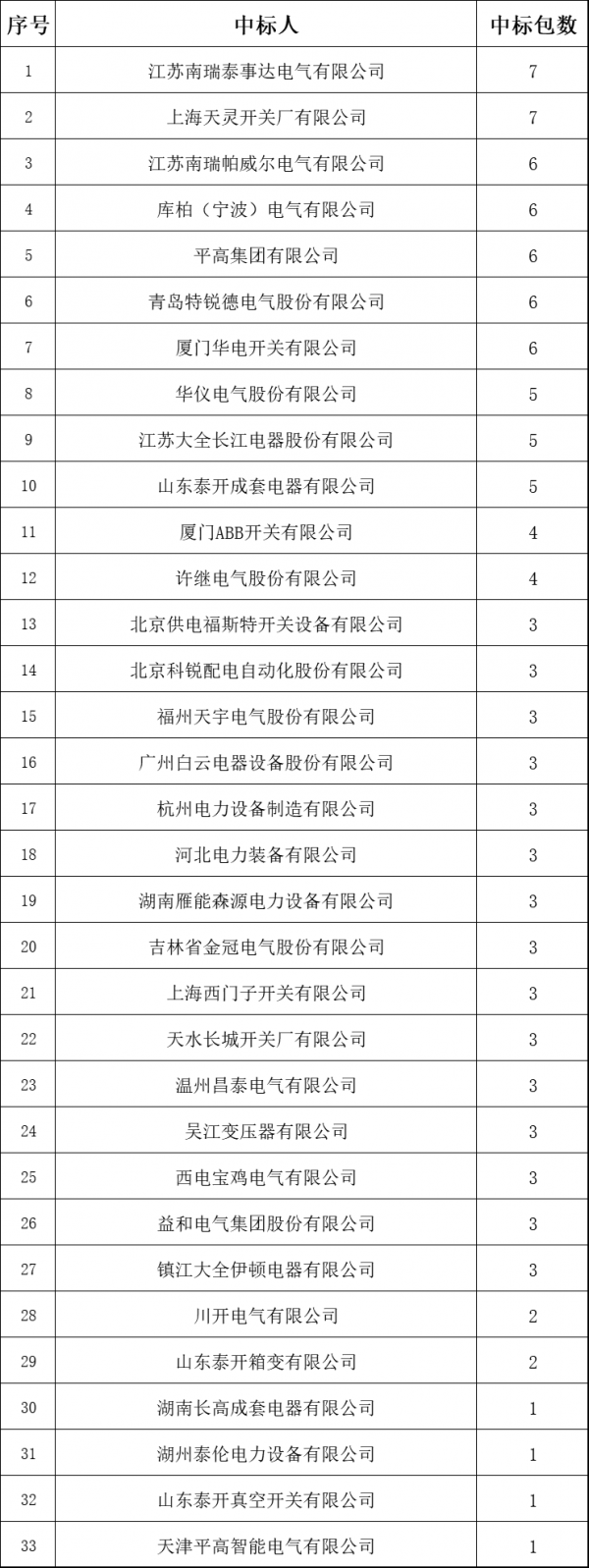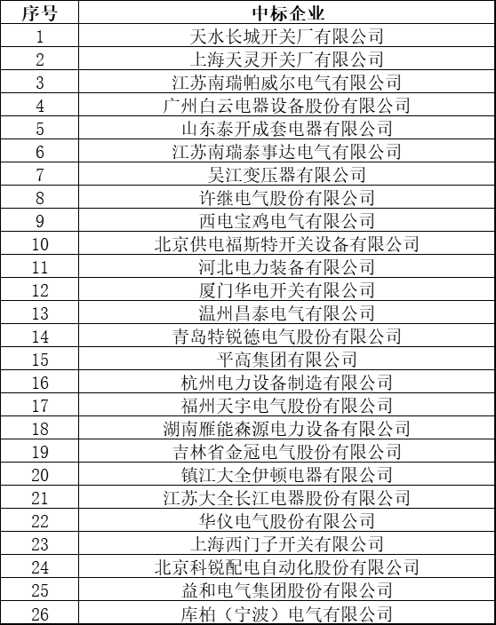 35(20)kV开关柜中标企业有11家,分别为:上海天灵开关厂有限公司(3)、天津平高智能电气有限公司(1)、平高集团有限公司(3)、许继电气股份有限公司(1)、库柏(宁波)电气有限公司(3)、江苏南瑞泰事达电气有限公司(3)、江苏南瑞帕威尔电气有限公司(3)、江苏大全长江电器股份有限公司(2)、厦门华电开关有限公司(3)、华仪电气股份有限公司(2)、山东泰开真空开关有限公司(1)。(注:(*)*代表中标包数)