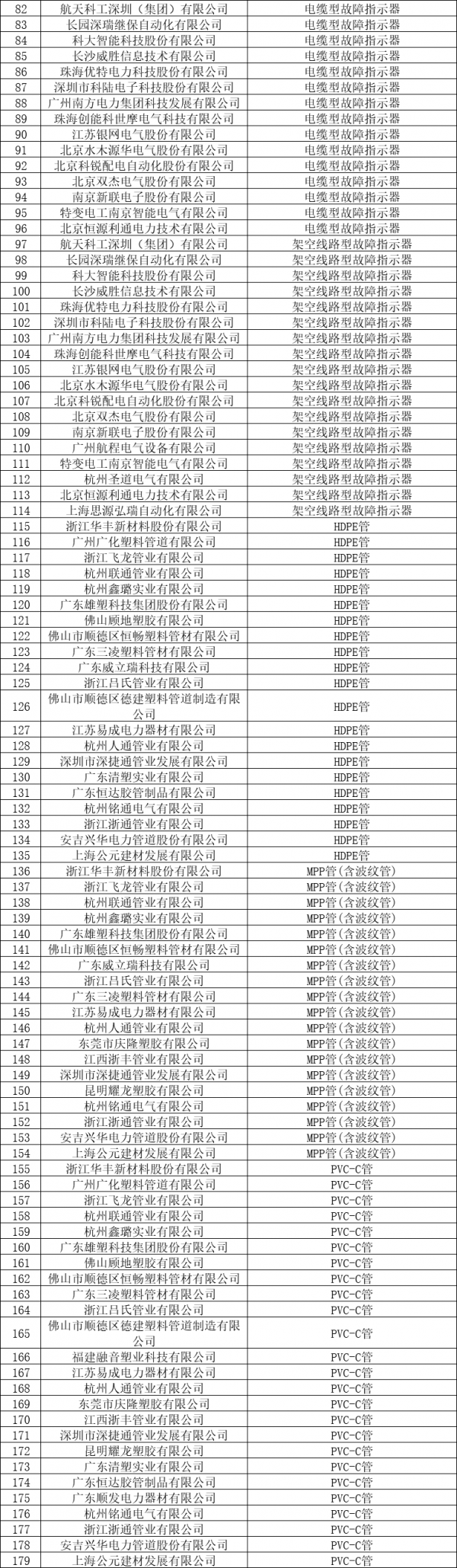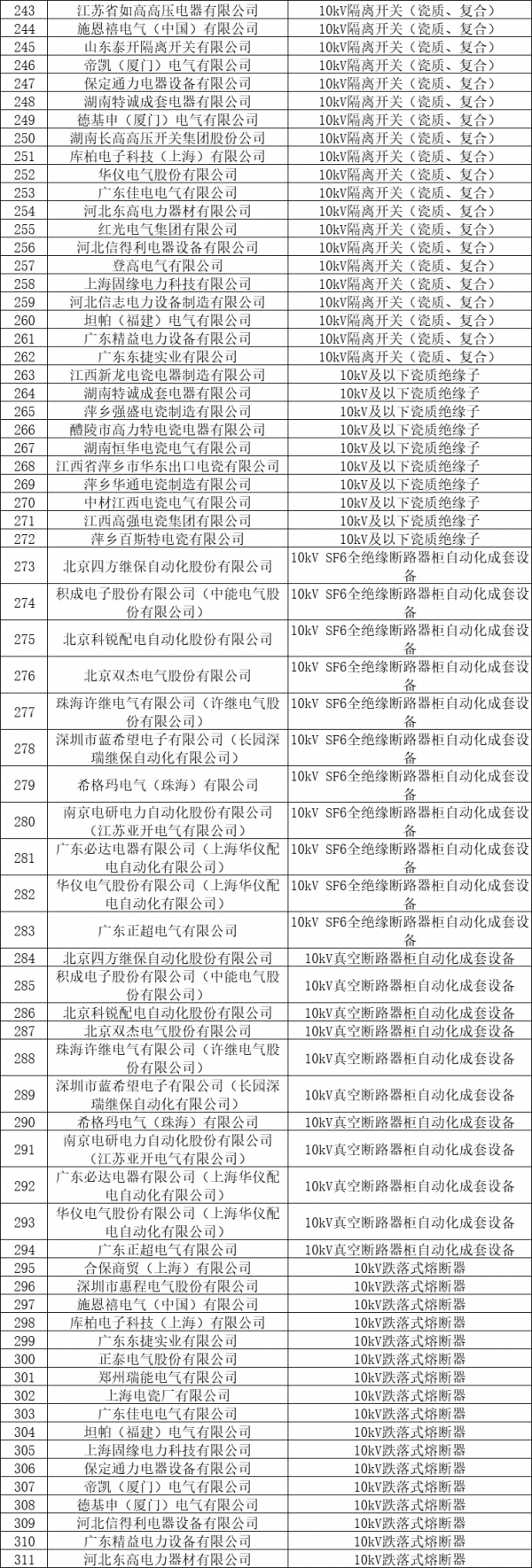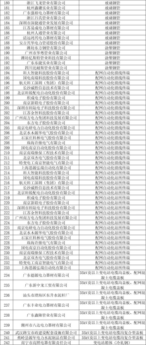 国内专业的电气产品销售与服务平台——电老虎网将其整理如下:总共有24个品类,即:变压器油中溶解气体在线监测装置、电能表用外置断路器、单相费控电能表表箱(PC外壳)、三相费控电能表表箱(PC外壳)、售电管理装置、变电站箱体(SMC材质)、变压器配电箱(SMC)、变电站箱体(不锈钢)、变压器配电箱(不锈钢)、电缆型故障指示器、架空线路型故障指示器、HDPE管、MPP管(含波纹管)、PVC-C管、玻璃钢管、涂塑钢管、配网自动化站所终端、35kV及以上变电站电缆沟盖板、配网混凝土电缆盖板、35kV及以上变电站电缆沟复合型盖板、变电站箱体(冷轧钢)、10kV隔离开关(瓷质、复合)、10kV及以下瓷质绝缘子、10kV SF6全绝缘断路器柜自动化成套设备、10kV真空断路器柜自动化成套设备、10kV跌落式熔断器,共166家合格供应商。