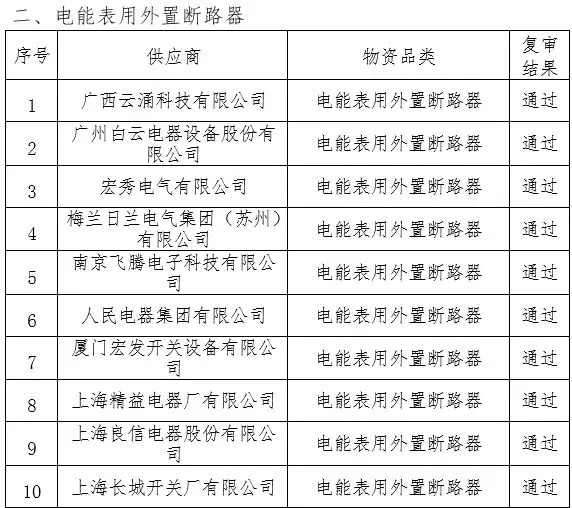 广东电网有限责任公司2018年上半年合格供应商:共涉变压器油中溶解气体在线监测装置、电能表用外置断路器、单相费控电能表表箱(PC外壳)、三相费控电能表表箱(PC外壳)、售电管理装置、变电站箱体(SMC材质)及变压器配电箱(SMC)、变压器配电箱(不锈钢)、电缆型故障指示器、架空线路型故障指示器、HDPE管、MPP管(含波纹管)、PVC-C管、玻璃钢管、涂塑钢管、配网自动化馈线终端、配网自动化站所终端、35kV及以上变电站电缆沟盖板及配网混凝土电缆盖板、变电站箱体(不锈钢)、10kV隔离开关(瓷质、复合)、10kV及以下瓷质绝缘子、10kV SF6全绝缘断路器柜自动化成套设备、10kV真空断路器柜自动化成套设备、10kV跌落式熔断器24个品类,243家合格供应商。