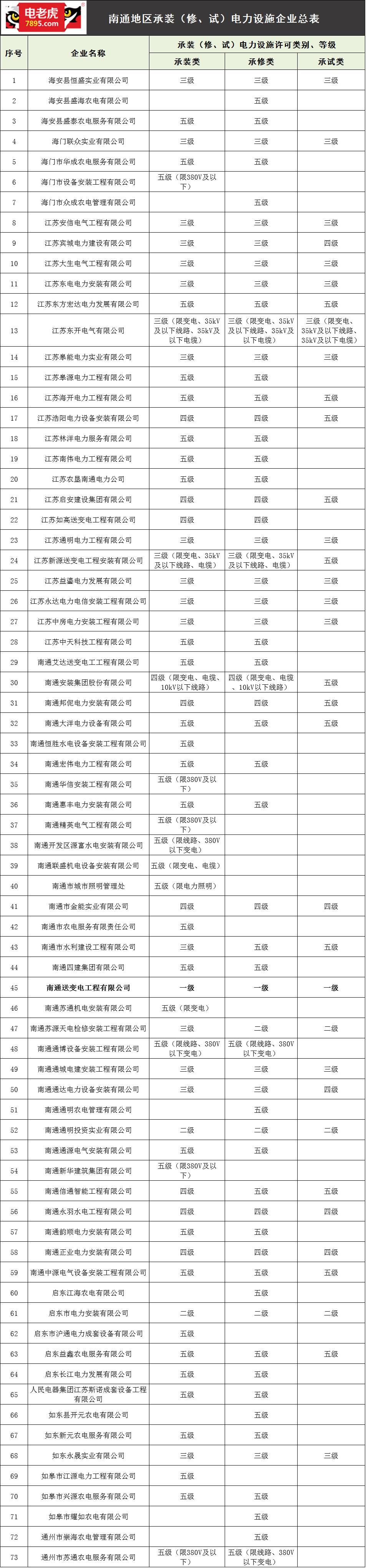 - 南通地区承装(修、试)电力设施企业名录【电老虎网发布】