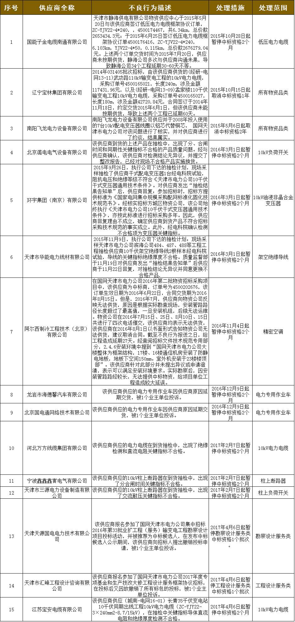 6、国网天津市电力公司关于供应商不良行为处理情况的通报(2017年6月)