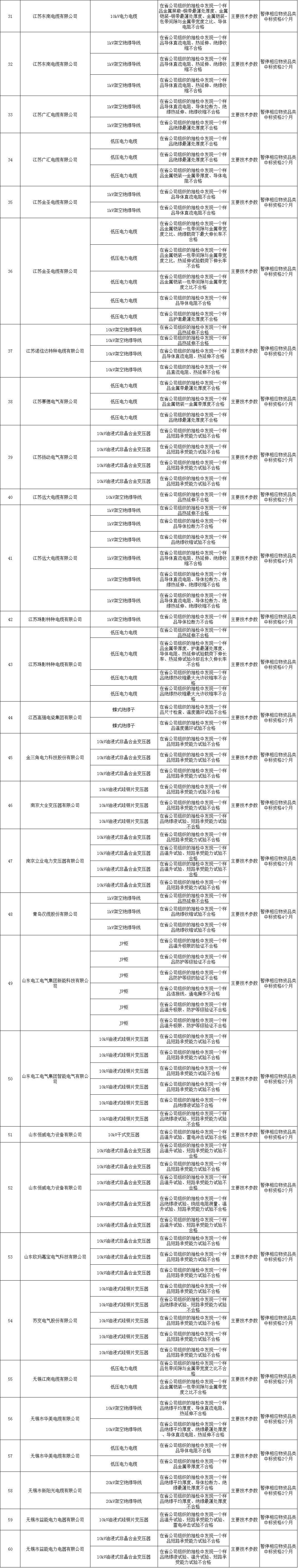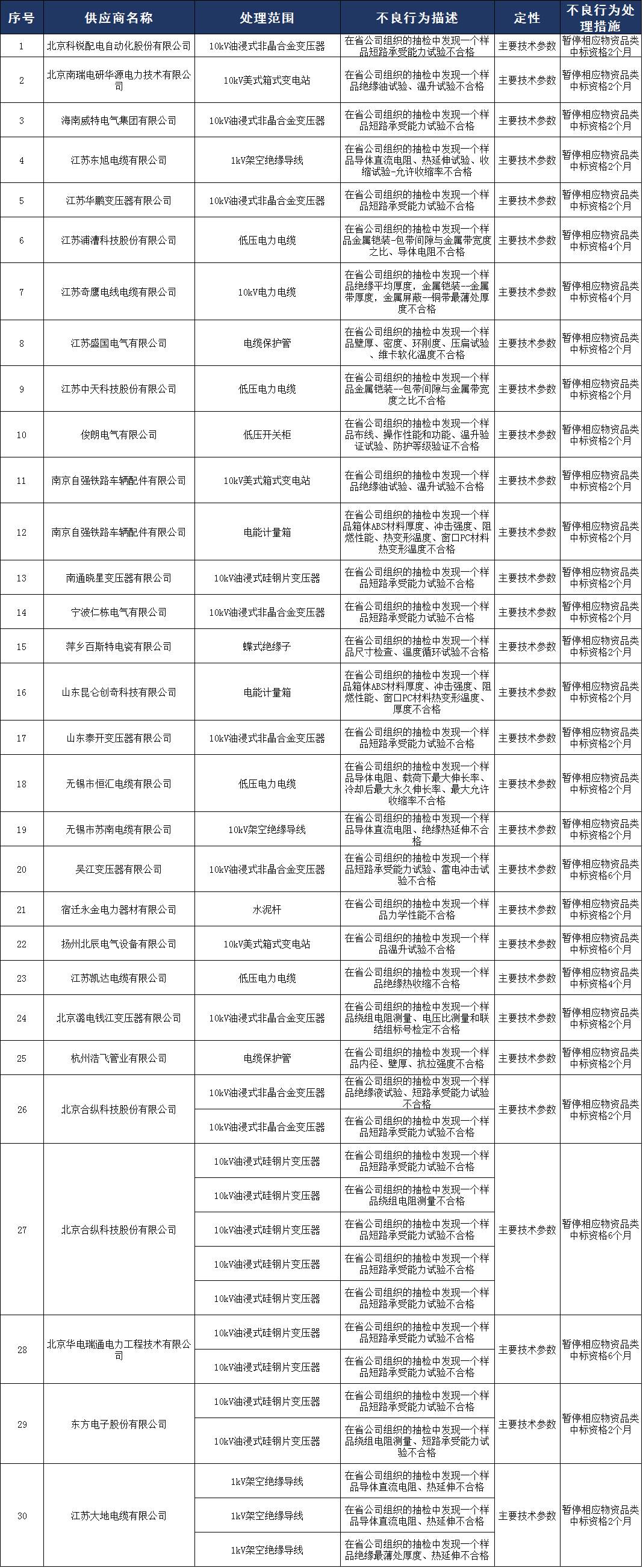 通报处理48家企业,其中4家企业被取消中标资格,企业均为暂停中标,处理范围包括电缆保护管、低压电力电缆、10kV变压器、JP柜等,详情如下: