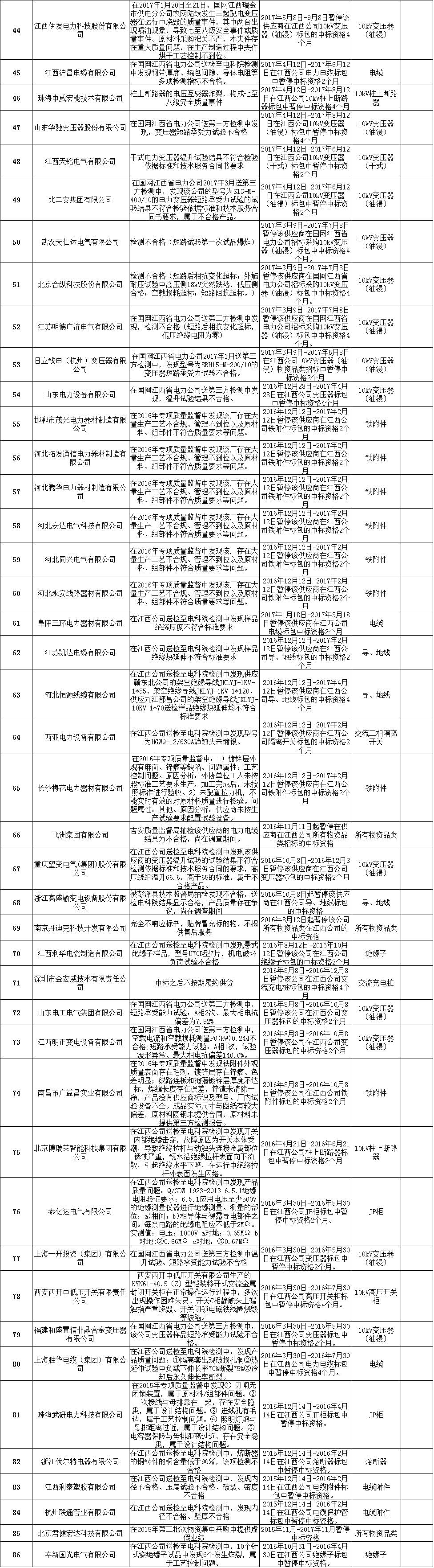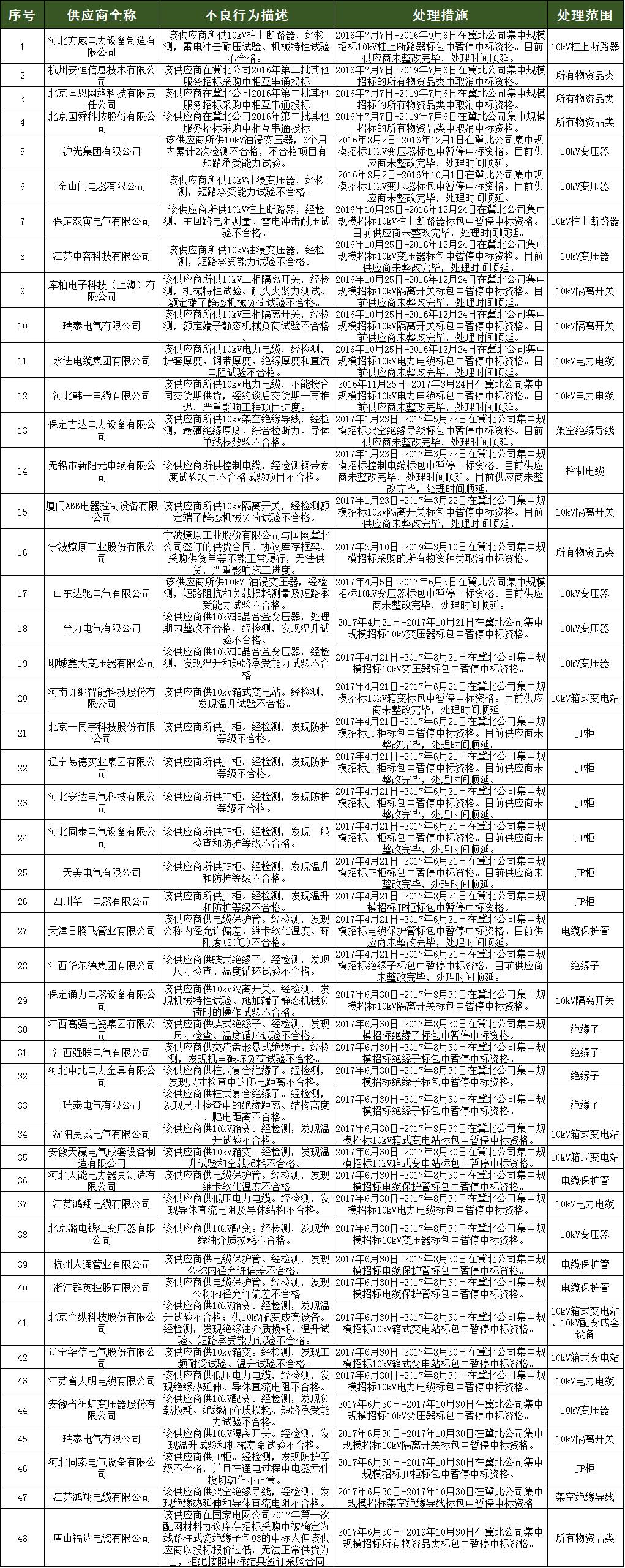 通报48家企业,其中3家企业被取消中标资格。其余均为暂停中标处理,处理范围为10kV柱上断路器、10kV变压器、绝缘子等物资。