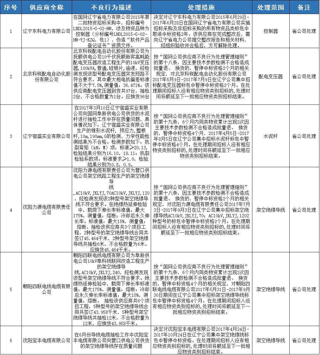 17、国网山东省电力公司关于2017年第六批供应商不良行为处理情况的公示(2017年6月)