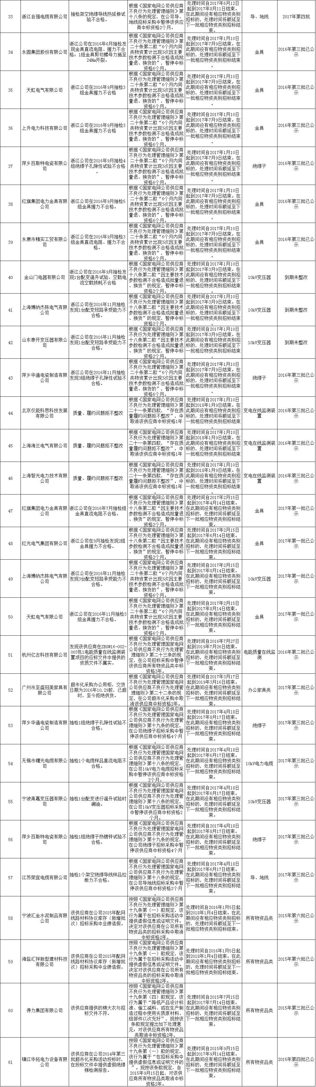 通报156家企业,处理范围包括铁附件、电缆分支箱、10kV隔离开关、金具、变压器等等,处理措施均为暂停中标资格,详情如下: