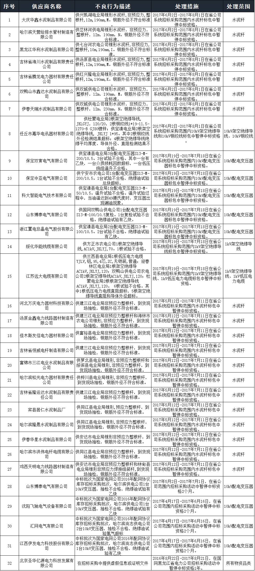 通报处理32家企业,均为暂停中标资格,处理范围包括水泥杆、10kV架空绝缘导线、10kV钢绞线、10kV配电变压器等物资品类。