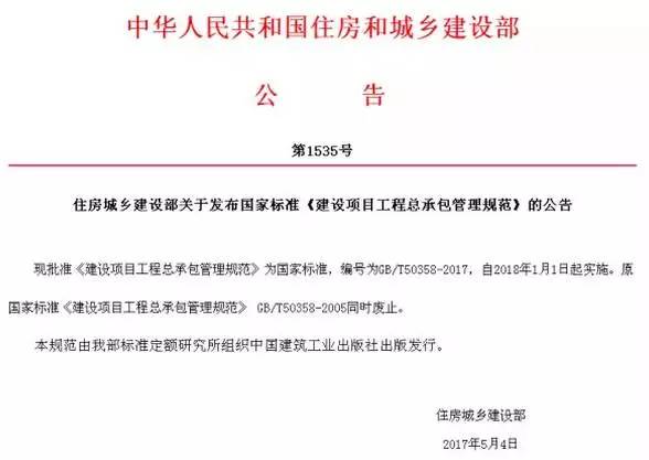 2017年5月住建部发布第1535号公告,批准《建设项目工程总承包管理规范》为国家标准,编号为GB/T50358-2017,自2018年1月1日起实施。